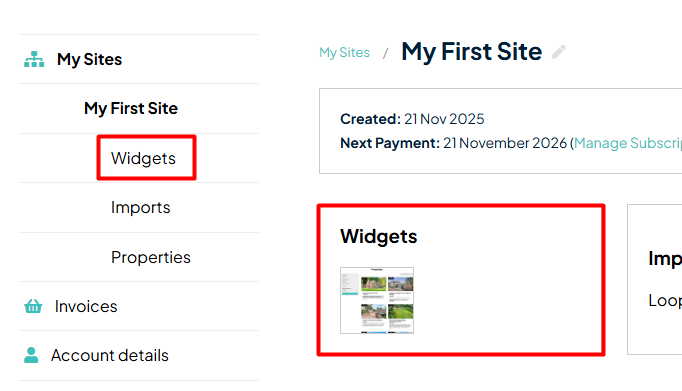 If you’re a paying user and want to edit a widget for an existing site you can simply log in to your account, select the site you wish to edit and click into ‘Widgets’ from the left hand menu or site dashboard: