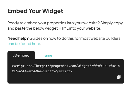Depending on which website builder you’re integrating with you can copy the JS embed code or the iframe code. Both of these can then be pasted into your website builder of choice where you want the properties to appear.